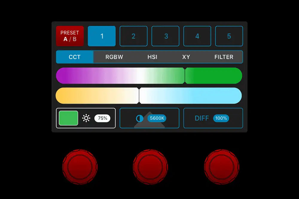 Featuring an extensive library of over 1300 industry standard gels accessible at the touch of a button, unleash your creativity on set at a moment’s notice. With five lighting modes: CCT, HSI, RGBW, XY and Filter, unlock endless possibilities with full control over your colour.